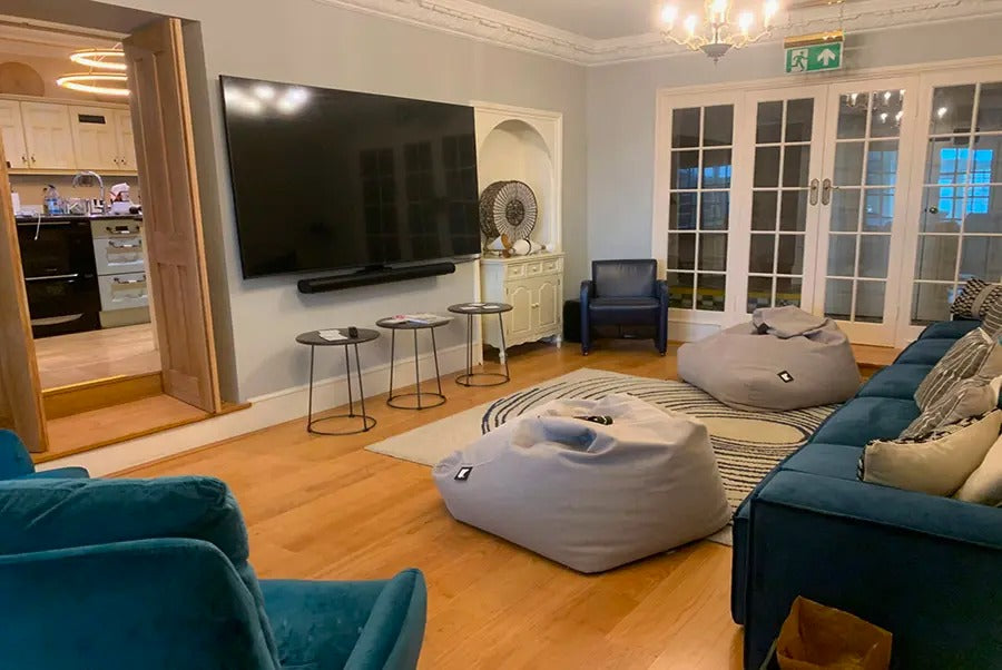 Spend the day relaxing in gardens carved by the sea, strolling through the bluebell woods or clambering over rocks. When evening rolls around, retreat inside the grand, double-height entrance to find cool and contemporary interiors with a sea-inspired palette by interior designer Karine Kaelin.